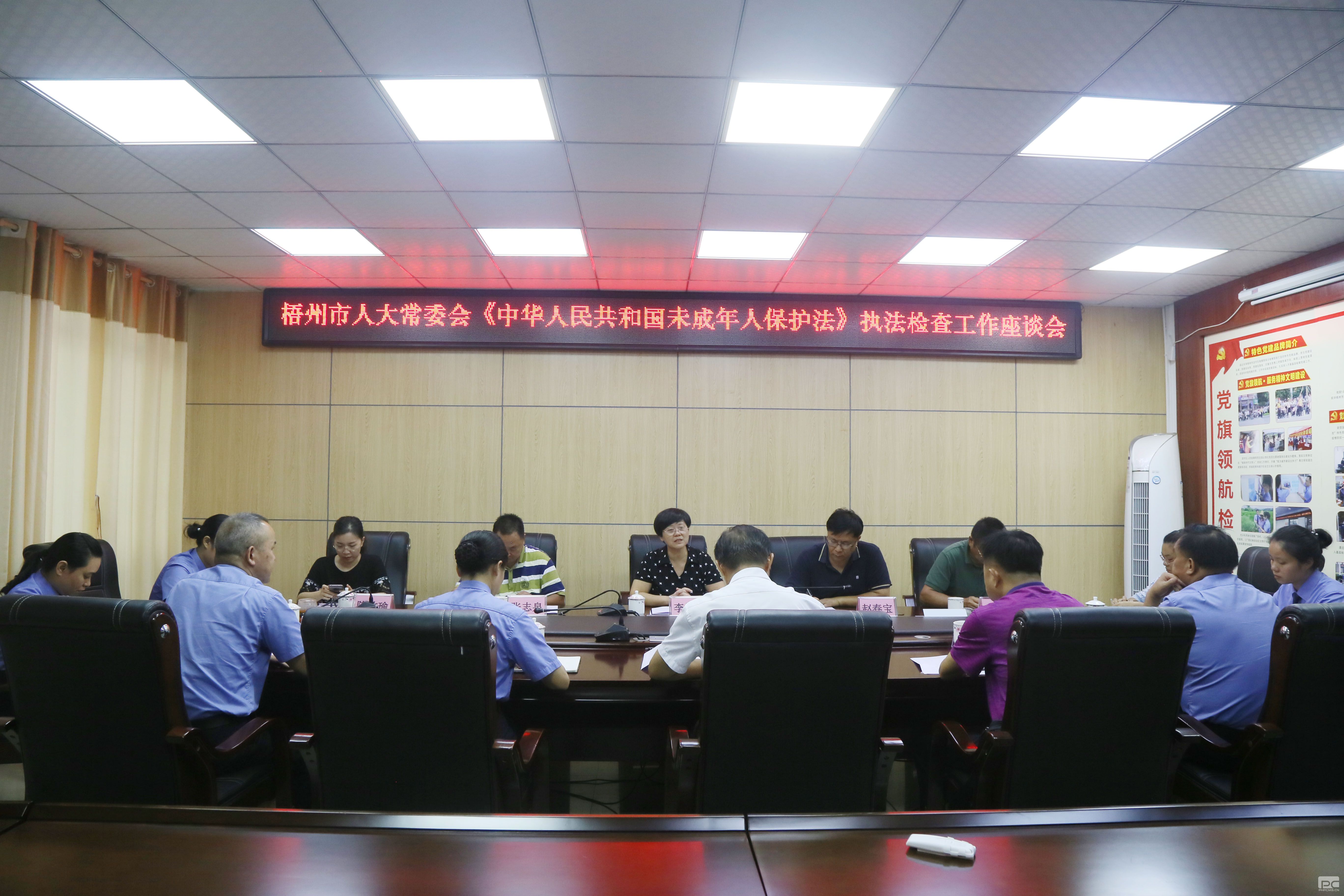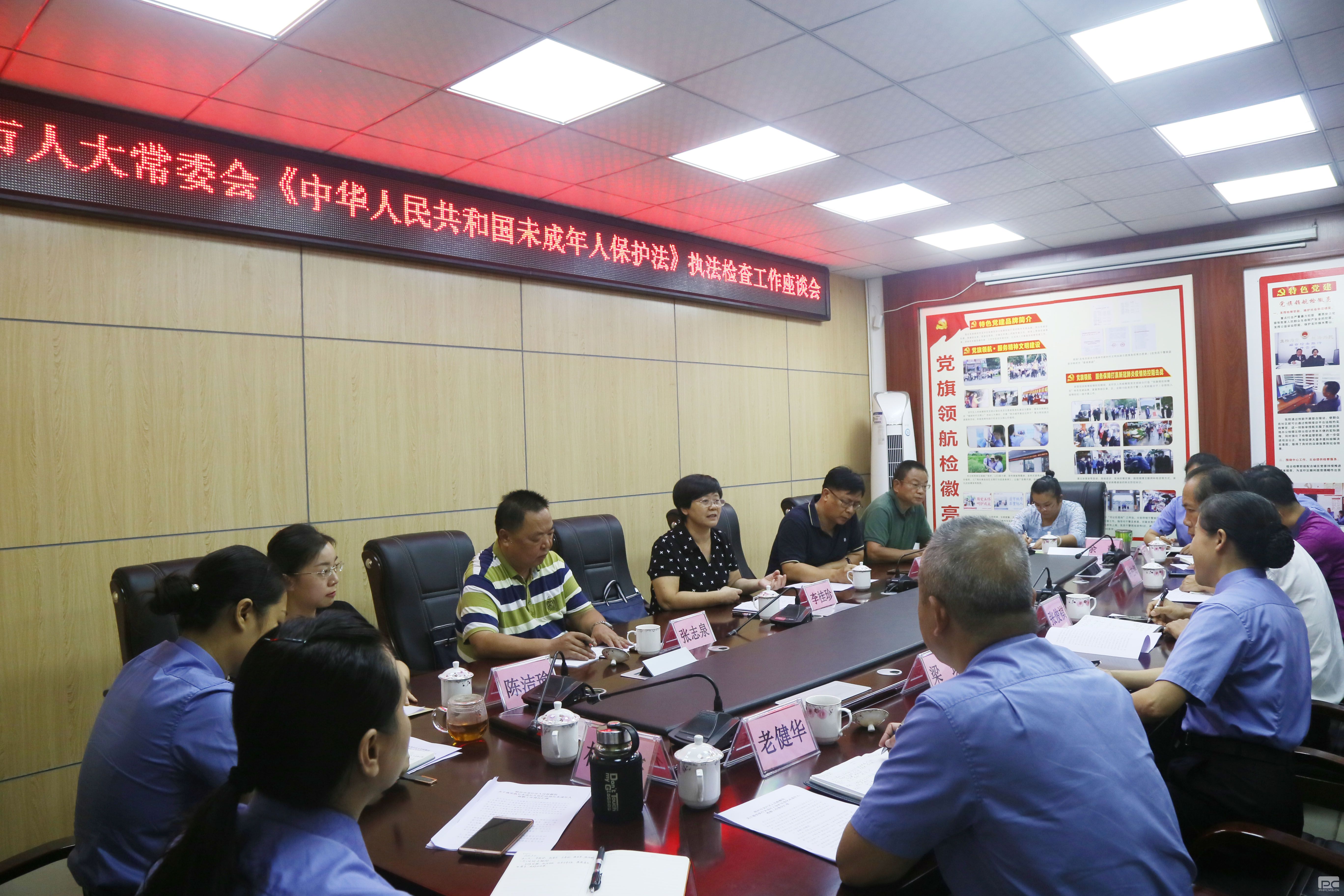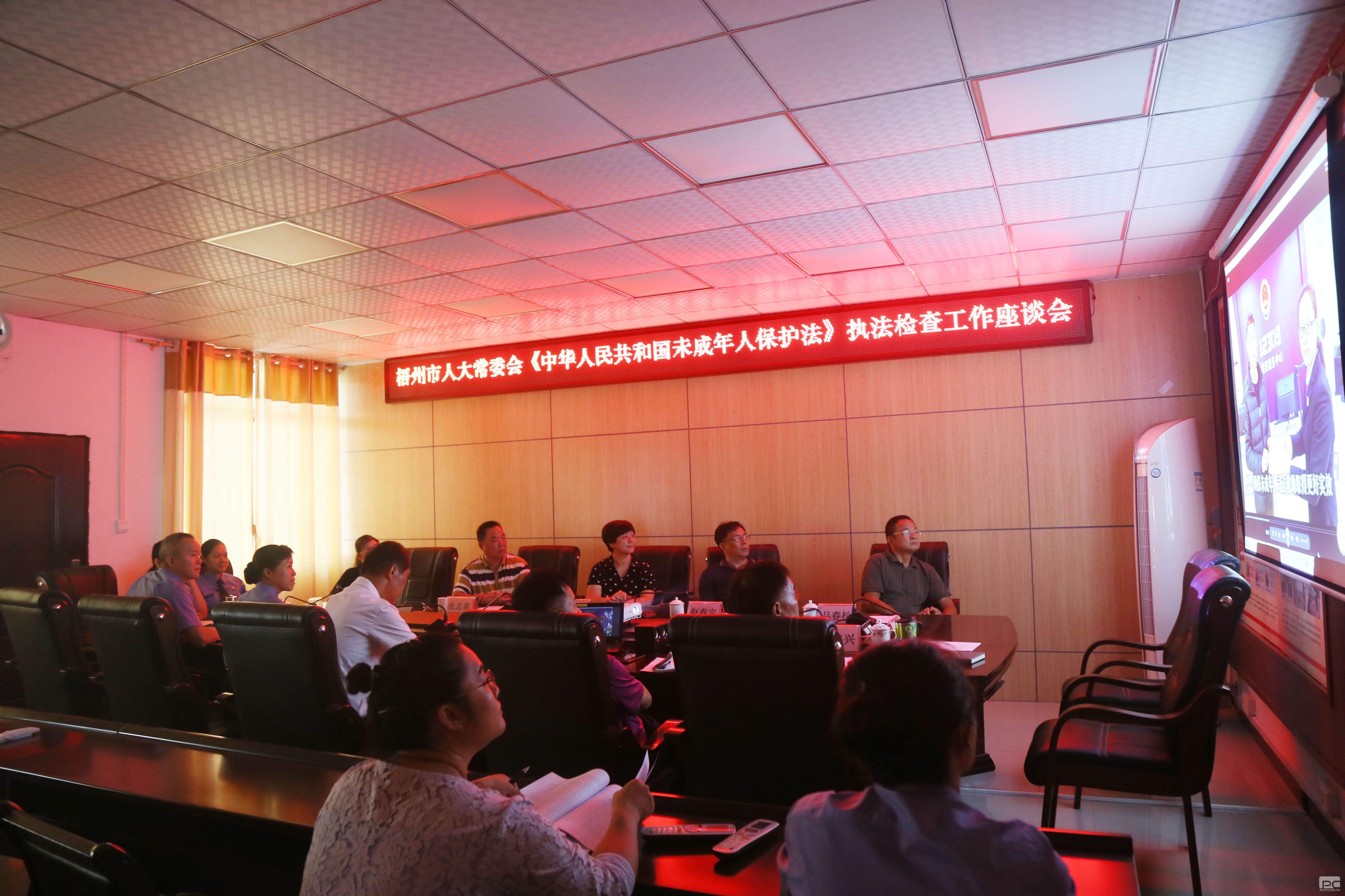 座谈会前,市人大常委会执法检查组观看了由龙圩区检察院制作的未成年人检察工作专题片《“七彩.未检”——用法治托起孩子的七彩明天》。